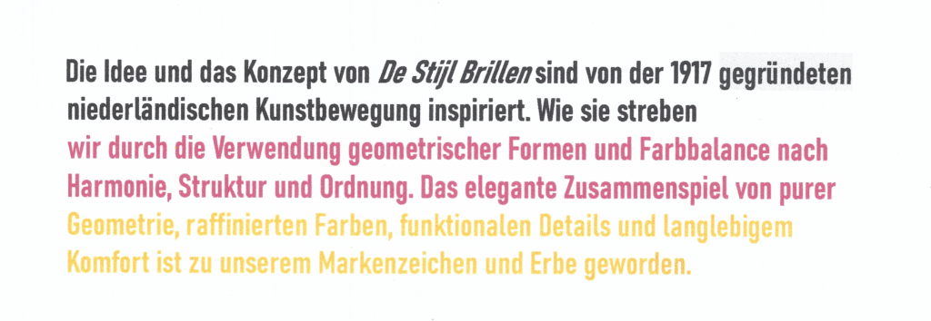 Het idee en concept van De Stijl brillen is geïnspireerd op de Nederlandse kunstbeweging, opgericht in 1917. Net als zij zoeken wij harmonie, structuur en orde door het gebruik van geometrische vormen en kleurbalans. De elegante interactie van pure geometrie, verfijnde kleuren, functionele details en duurzaam comfort is ons kenmerk en erfgoed geworden.